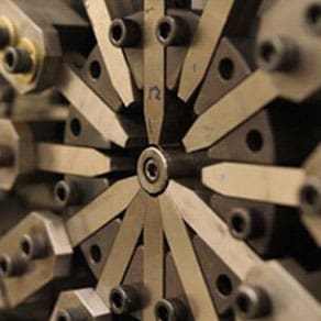 During wire EDM process, a metal piece is placed into a dielectric bath where a charged thin metal wire uses electrical sparks to melt the material and make cuts. The spark’s voltage bridges the gap from the wire to the workpiece which causes the material to melt. The metal wire never contacts the workpiece. The dielectric fluid controls the sparks, cools and flushes away excess material.